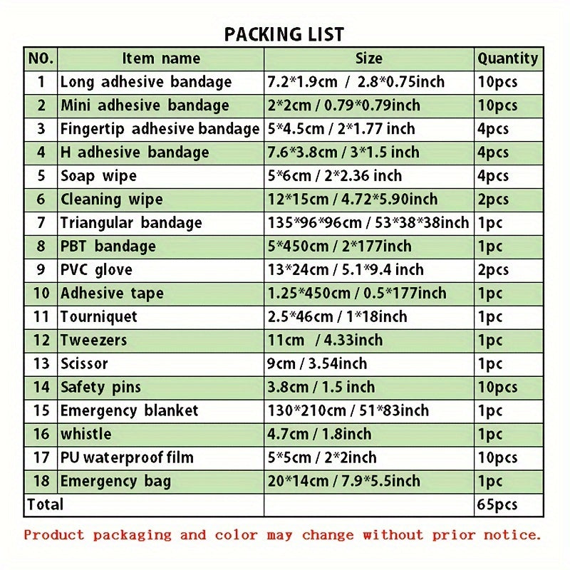 Band aids 10PCS, Gauze pads 2PCS, Alchohol Desinfect pads, Triangular bandage 1PCS, Emergency blanket 1 PCS, Card knife 1PCS, Ice pack 1PCS, Tape 1PCS, Elastic bandage 1PCS, Scissors 1PCS, Tweezer 1PCS, Mask 1PCS, Pins 10PCS, Tourniquet 1PCS, Clean wipes 2PCS, Flashlight 1PCS, First Aid manual 1PCS, Emergency bag 1PCS